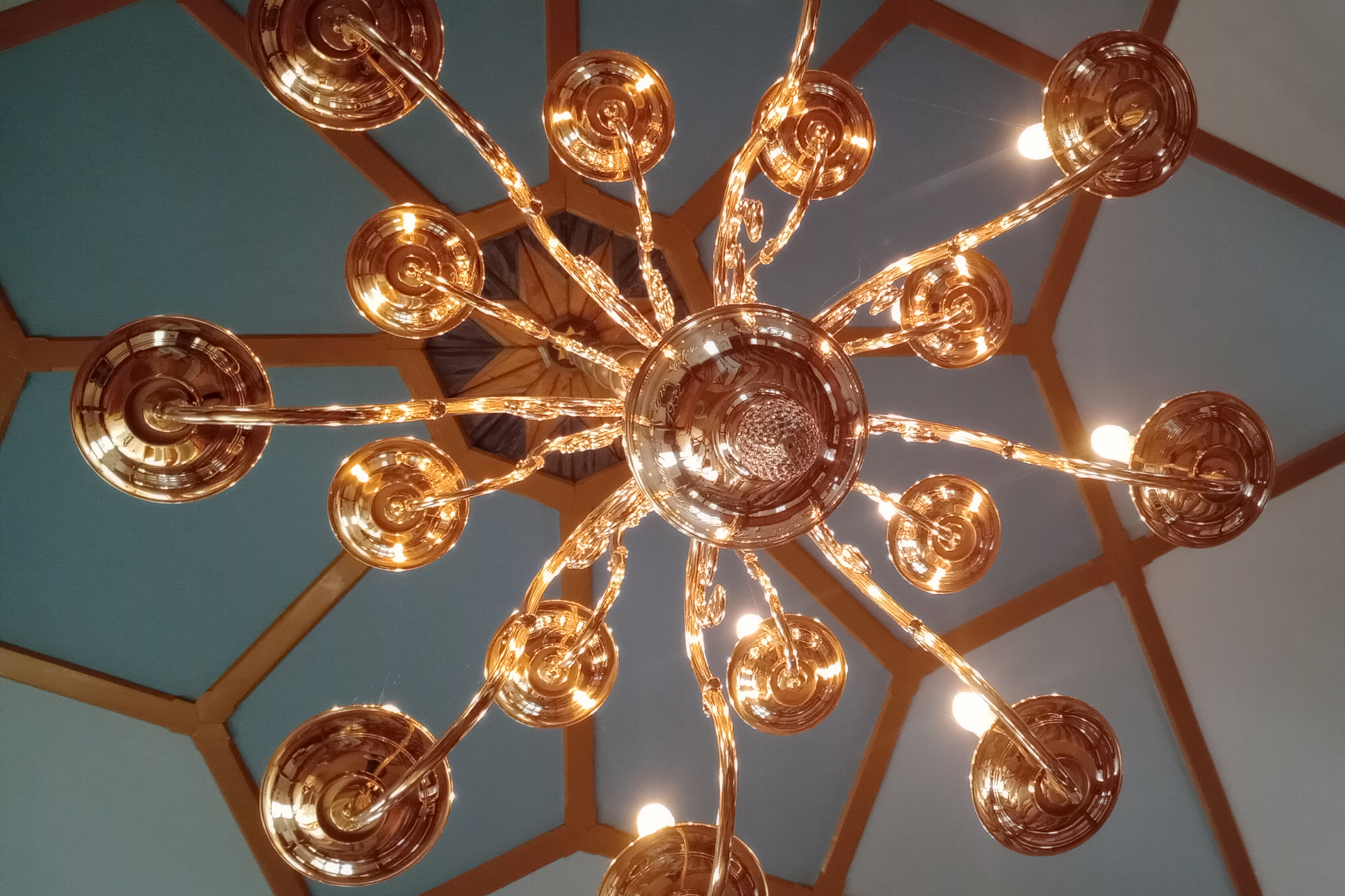 Bænke, søjler og rækværket på balkonen er holdt i brun og rustrøde farver, mens felterne i loftet er malet i sarte blå nuancer. Gulvet er et afslebet lyst trægulv.